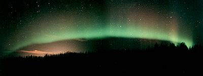 まもなく北方向にスポットライトのようなオーロラがいくつか見えたと思うと、アッという間にどれもが濃くなりとうとうつながり、見事なカーテン状のオーロラになりました。その時間、1分の出来事。カーテンの裾は濃い緑で、カーテンレールの部分はすじが入って赤っぽい感じがします。