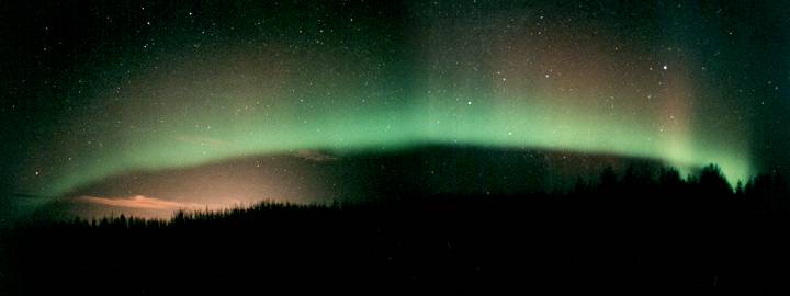 北東の空から北西の空までつながったアーク状(弧状)のオーロラ。 28mmではとても入りきらないので、2枚の写真を合成してみました。