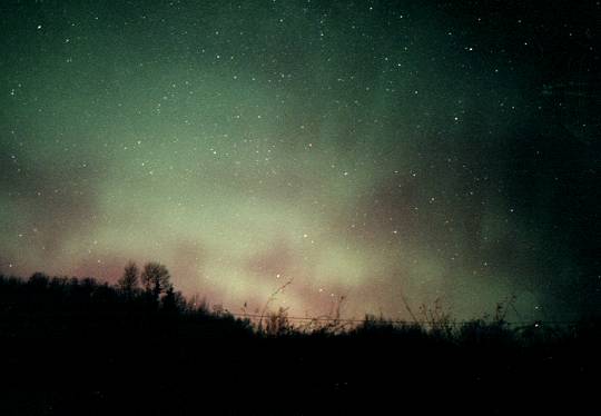 東の空にも低空に光害がありましたが、空全面に緑のオーロラが広がってる様子がわかります。