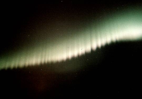 薄雲が全天を覆ってしまったのですが、時折写真のようなきれいな明るい縦すじ構造のオーロラが見られました。 すじ自体が移動してしまうため露出を切りつめましたが、明るいので結構写りました。