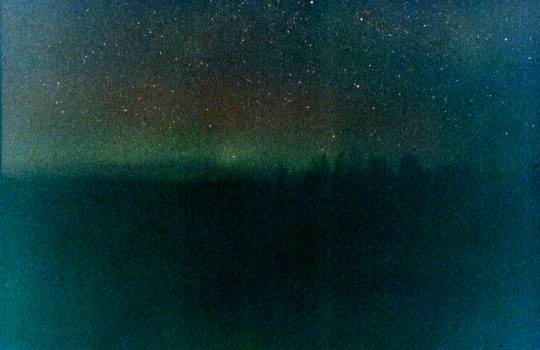 初めてのオーロラは北の低空に現れたぼんやりとしたもの。 慌ててカメラを向けたのですが、肉眼同様、緑がかったかすかな姿しか捉えられませんでした。