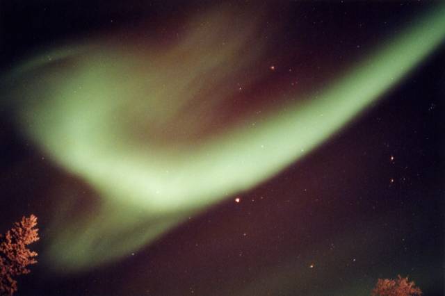 オーロラは天頂付近でカーテン状の構造がくずれ、おおきくうねっていきました。肉眼で見ていても、どんな構造になってるのか、わかりにくかったです。 色はきれいな青緑色。明るく立派でした。