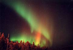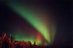 ゆっくりと形を変えるオーロラの中に、やがて赤く輝く部分が出現。北の低空側のオーロラの一部が活発化し、その上側に赤い光の柱が立ち、手前側のオーロラと重なったのでした。この赤い部分は短時間で姿を消し、オーロラはうねりながら北側へ去っていきました。