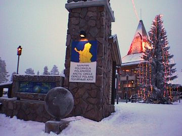 画像は、サンタクロース村の入口にある北極圏を示す看板とオブジェ。