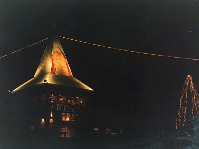 夜になると右側のように輝いて、よくわかるようになります。この電飾は昨晩、飛行機の窓からも見えて「何だろう?」と思っていたのでした。