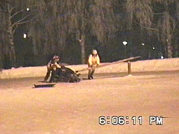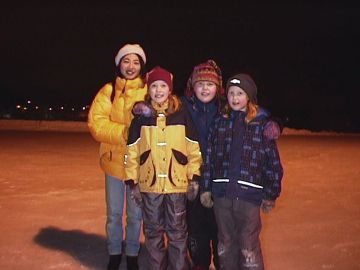 ホテルへ歩いて帰る途中、賑やかな子どもの声が聞こえたのでのぞいてみると、アイスホッケー場で小学生の女の子が3人で回転式のソリで遊んでいました。そっと遠くからビデオに撮ろうかと思っていたらすっかりばれてしまったので、こちらから近づいてソリを押して一緒に遊びました。