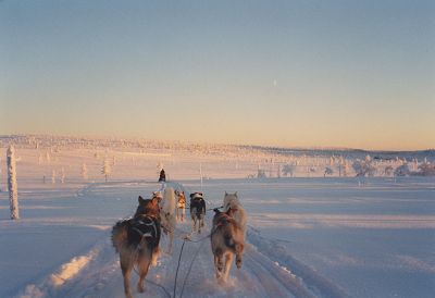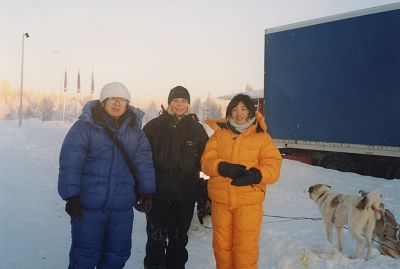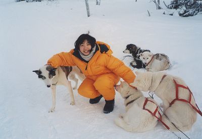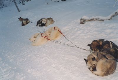 前回(2000年3月1日)はトナカイそりに乗ったので、今回は犬ぞりに乗ろ〜!と出かけました。7頭の犬たちがソリを引き、私と怪鳥さんで乗り手と運転手を交代で行います。