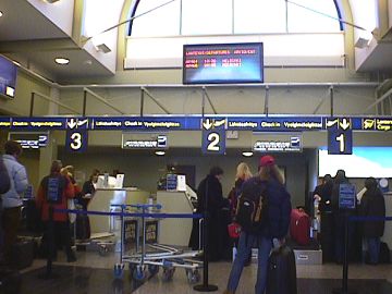 イヴァロ空港カウンター(左)と、フィンエアー機(右)。