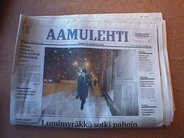 起きたらすっかり晴天で、昨日の吹雪は何だったの?というくらい。朝食を食べに最上階へ上がったら、真っ青な空とやや雪の残っている街が見渡せました。でもたしかに、タンペレの地方新聞らしき新聞のトップニュースには「大雪のフィンランド」で、吹雪のタンペレの写真が載っています。北欧フィンランドでも、トップニュースとなるくらいの大雪だったようです。