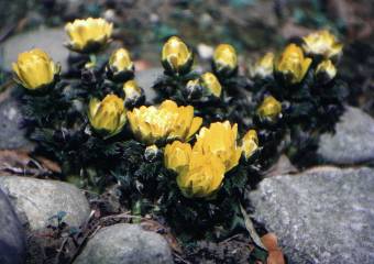 福寿草・・・旧暦の新年(今の暦で1月終わり〜2月始めころ)に咲くため「元日草」とも言われ、新年の季語にもなっています。 いくつも寄りそって咲くこの花は、金色の花色も名前もめでたい縁起物として、江戸時代から正月の飾り物に喜ばれました。