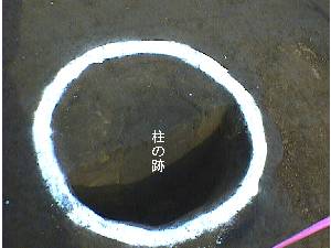 大きい門柱の穴。白く囲んだ部分の左側にも、古い門柱の跡があります。