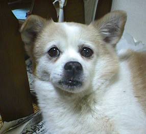 | 特徴 | 雑種、小〜中型犬、17歳、オス、白色でうす茶色のブチ模様、尻尾がない(ケガをしたあと自分で噛んでなくなった)、首輪なし |