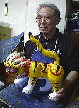 楠田正男さんが作った張り子の虎は、多くの賞を受賞している素晴らしいものです。(左)