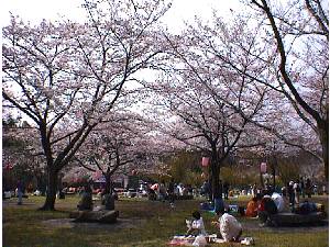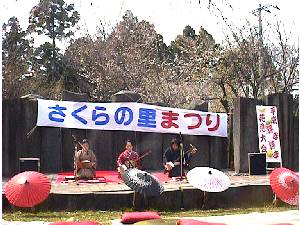 ステージでは長唄が披露され情緒ある音色が響きます。 花見の宴の頭上には満開の桜。