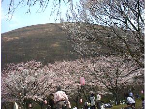桜の花の上には富士山型の大室山。 「伊東桜」という種類の桜もあります。