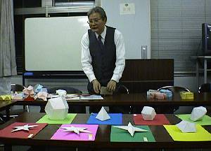 先生の前に置かれているたくさんの立体は、塾生が適当に書いた三角形を使って先生が素子を作り、組み立ててくれた物です。