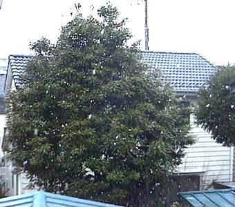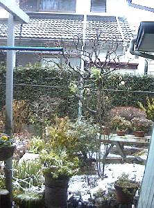 左:庭に積もった雪。 右:2階の窓から見た様子。大粒の雪が勢いよく降りました。