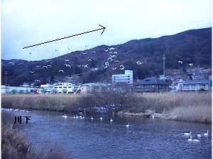 ちょっと川下から、何羽かグループになって飛び立ちます。
