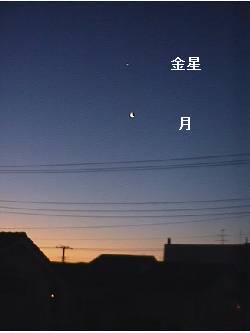 日の出前の南東の空に、金星と細い月が並んで輝いていました。