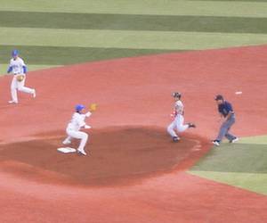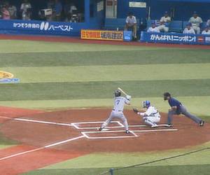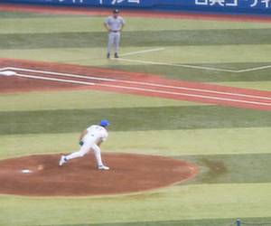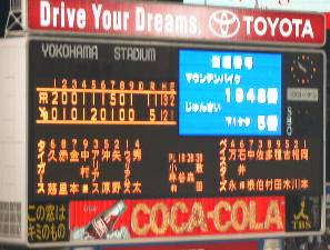 3回裏に、「横浜の送球防御」が判定されてもめているところ。