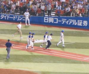 こちらは、金城選手が守備の途中で突然胸を押さえて倒れて、担架で運ばれるところ。
