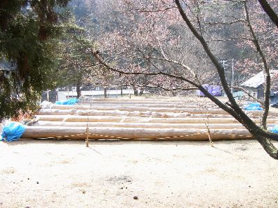 注連掛けに8本の御柱祭がそろったところ。