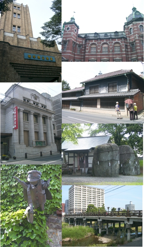 左側、上から下へ。「岩手県公会堂」、「旧盛岡貯蓄銀行本店」(盛岡信用金庫本店)、ブリキの少年『風の又三郎』。