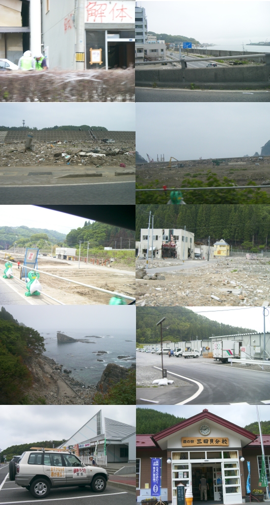 左側上から右下へ。宮古市内で「解体」と書かれた住宅、津波が乗り越えた宮古の海岸、壊れた田老の堤防、海まで何もない風景、壊れた田老駅、山側の少しの建物以外はすべて片付けられて更地になっている、海岸に残る津波の跡、山側に造られた仮設住宅、「頑張ろう!宮古」「かならず春が来る」と書かれた車、学校の跡地に建つ「道の駅三田貝分校」。