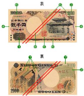 以上のように多くの工夫がされている2千円札ですが、さらに目の不自由な人にもすぐわかるように、デコボコの識別マークがつけられています(これは、他のお札にもあります)。2千円札の場合は、左右のはじに●を3つたてに並べたものがそうです(点字の「に」を図案化した)。