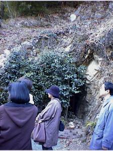 見学者の向こう、サザンカの植えてある奥が、壕の入口。とてもさりげない場所です。