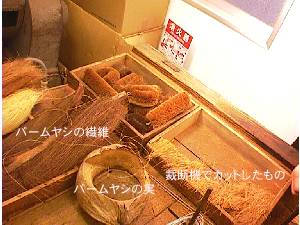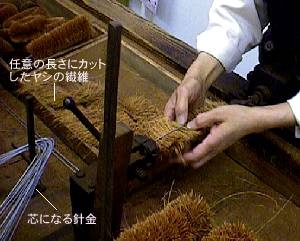 材料はスリランカ産パームヤシの実からとれる繊維と中国産のシュロ。それらを10pほどに裁断し、針金ではさんでねじる。針金が左右の真ん中に来るようにしたり、はさむ繊維の厚さを同じにしたり、手作業でしかできない。