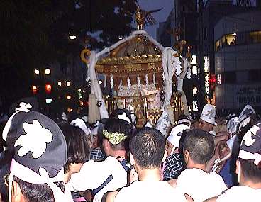 夕暮れの中を大勢の担ぎ手で、八つの御輿が移動していきます。