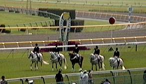 尾花栗毛のトウショウファルコ(中央)をはさんで、ユートグラスなど美しい芦毛の馬たち。