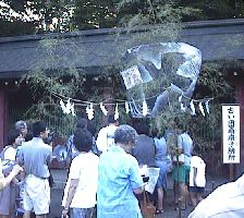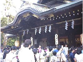大勢のお参りする人々。 古い団扇はここへ納めます。