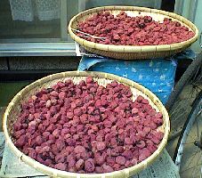 真っ赤に染まった梅を干しているところ。