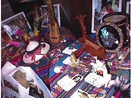 ボリヴィアの民芸品と村の様子の写真。 踊る新婦。その向こうで踊るのは新郎の両親。