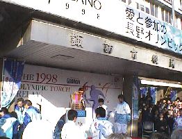 諏訪市内の最終ランナーが市役所前に到着して、市長の手を通して聖火台に点火。