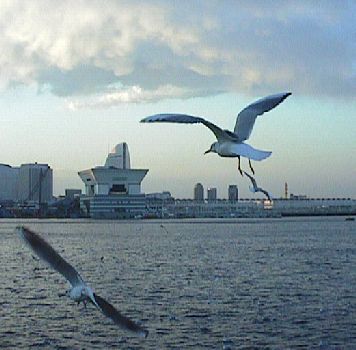 ランドマークタワーの上空に黒くたくさん見えるのは、群になって飛ぶカモメたち。