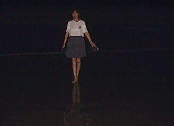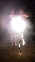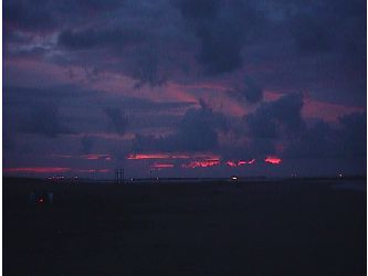 アウトドア用バーナーでお湯をわかし、テーブルにお菓子を広げてお茶しているうちに、だんだん夜が明けていきました。朝焼けで、雲の間が真っ赤に見えました。 すっかり明るくなると、こんな風景の場所です。サファーたちもあらわれ、波間で練習していました。