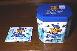 左は優勝記念のVマークと「セントラルリーグチャンピオン」のステッカーつきのメガホンと、キャラクターのホッシー君がついたメガホン。右は「ベイスターズサブレ」。