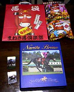 赤い「馬袋」の中に、東ハトの「馬結び」と「馬祭」といいうお菓子が入っています。このお菓子には、サラブレッドのカードが入っているのですが、今回は「サクラエイコーオウ」と「トウショーボーイ」でした。