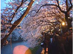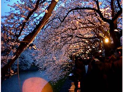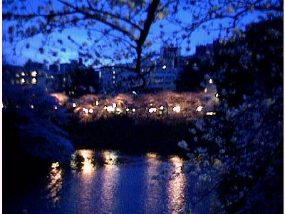土手のこちら側は、ライトアップされた桜を見る人の行列(右)