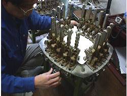 ▲機械に皮をはさんでのばしながら胴に貼る。 ▲専用のノリでふちを貼る。