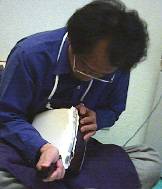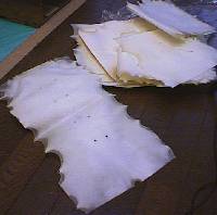 *ちょっと写真ではわかりにくいですが、実際は“犬の皮”と“合皮”では、仕上がりも手順もちがいます。昔は「三味線には猫の皮」でしたが、いまは犬の皮を使います。 三味線作りの材料である木も皮も、たいへん貴重なもので、現在は東南アジアからの輸入しか手に入らないそうです。