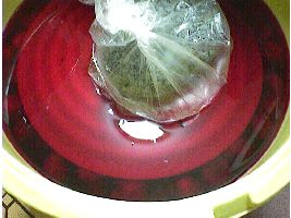 紫蘇をもんで色を出します。まずアクを出すために、塩で軽くもむと泡とにごった水が出ます。それを捨ててしまいます。