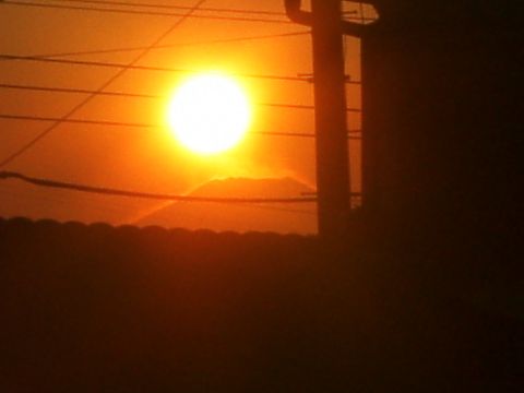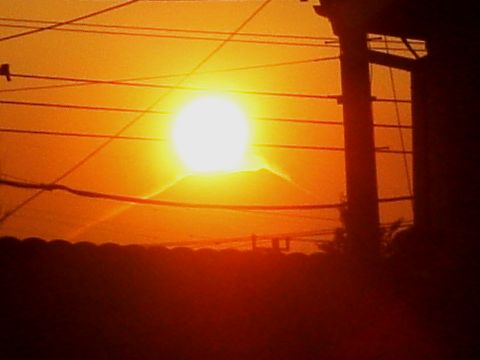 先日テレビでダイヤモンド富士(富士天頂から日が昇る・日が沈む)の話題が出ていたので、狙ってみました。天頂よりも若干右(北)側に日が沈んで、右側の稜線にやや引きずられながら沈む太陽が印象的でした。
