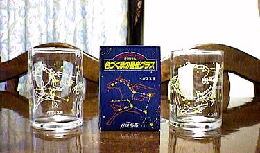 買い物のとき、スーパーでおもしろいものをみつけました。冷たい物を注ぐと色が白からオレンジに変わる、星座の絵のグラスです。コカ・コーラのミニサイズ(160ml)6個入り、1パックに1個ついてくるのですが、気に入ったので2個そろえてみました。