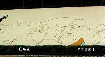 この公園は特にテーマがあるわけでなく、ごく普通の広場なのですが、ある一面だけにレリーフで星座が描かれていました。星座絵も重ねて彫られ、まちがないなく白鳥座とペガスス座です。で、バックの曲線はなんだろぅ?って考えたら、もしかして天の川かぁ!?と気づいたのです。てことは、もしかして天の川で踊っている男の子と女の子は、単なるイメージレリーフじゃなくて、織姫と彦星を意識しているのかしらぁ、と思ったのです。