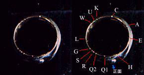 リング正面(デザインのある部分)が、木星の0度(体系2)です。木星表面に衝突した核の経度を、めだつものについて刻みました。
