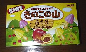 今回私がみつけたのは、『信州限定 きのこの山 〜直送便 りんご味/栗味〜』です(1000円)。 ご存じ『きのこの山』の巨大版ですが、チョコレート部分がピンクのりんご味と、黄色の栗味の2種類が入っています。